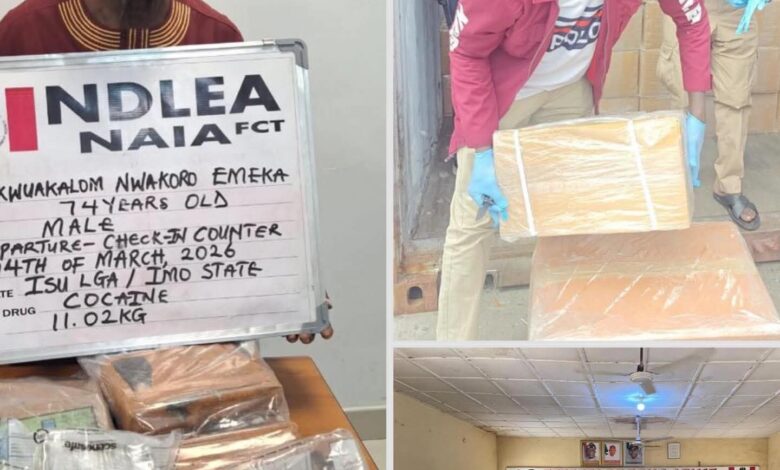 The septuagenarian who claimed he was travelling to London, United Kingdom for vacation, was arrested by NDLEA officers at the departure hall of the Abuja airport while attempting to board a British Airways flight BA082 to Heathrow London on Saturday 14th March 2026.
