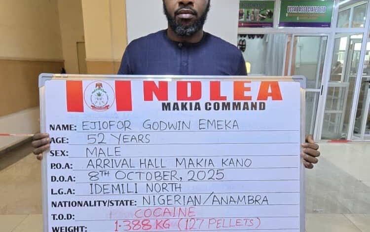 The National Drug Law Enforcement Agency (NDLEA) operatives have arrested Ejiofor Godwin Emeka, a 52-year-old businessman, at the Mallam Aminu Kano International Airport (MAKIA) in Kano.